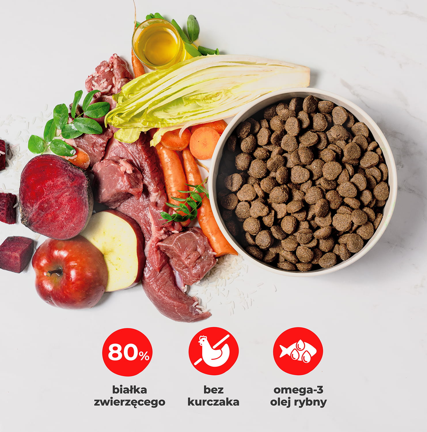 - Karma zawiera starannie dobrane składniki, dostarczając wszystkich niezbędnych witamin i minerałów, wspierając układ odpornościowy, trawienie oraz ogólną kondycję fizyczną. Dzięki temu Twój pies może cieszyć się stałym poziomem energii przez cały dzień, a jego organizm otrzymuje wszystko, czego potrzebuje do utrzymania optymalnego zdrowia i dobrej formy.